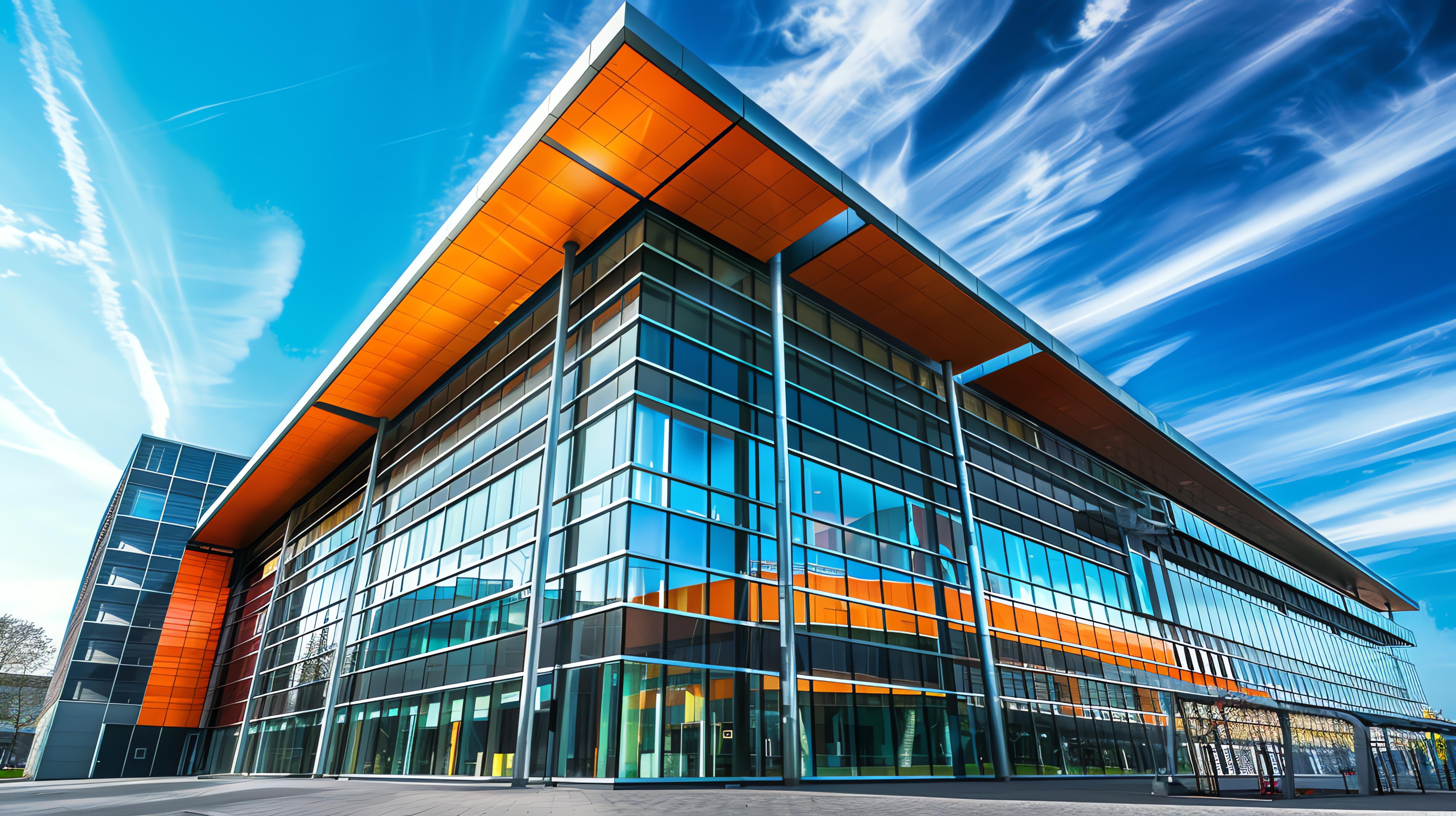 The image shows a modern glass and steel office building with an orange accent.